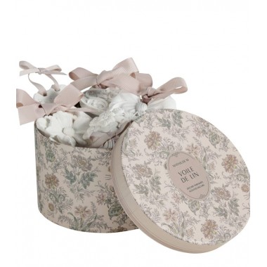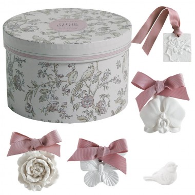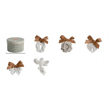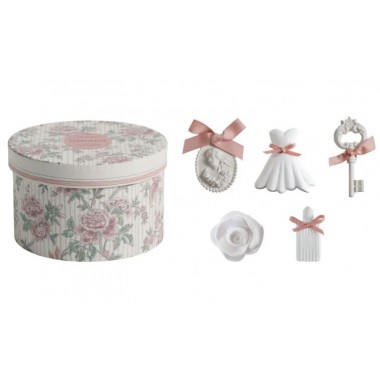 Esta magnífica caixa é perfeita para presentear quem mais gosta. As suas 5 pequenas decorações de gesso perfumadas irão liberar lentamente seu doce perfume por muito tempo...