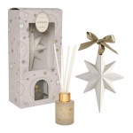 Descubra esta bonita caixa Fête Céleste. Contém um difusor de perfume para casa e uma decoração perfumada em gesso feita inteiramente à mão, inspirada na beleza das estrelas. Delicadamente colocadas no frasco, as hastes de rotim branqueado são impregnadas de perfume por ação capilar, difundindo-o gradualmente no ar. Este difusor permite perfumar uma pequena divisão durante várias semanas.